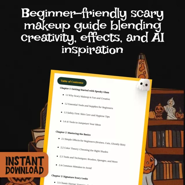 Ready to dive into the world of creepy transformations and hauntingly glamorous looks? Frightfully Fabulous: A Beginner’s Guide to Scary Makeup is your ultimate Scary Makeup Starter Guide, designed to help beginners master the art of spooky glam without stress. Whether you’re getting ready for Halloween, cosplay, or a themed party, this downloadable guide walks you step-by-step through everything from simple effects to full-on monster makeovers. With clear instructions, creative tips, and even AI-powered inspiration, you’ll gain the confidence to turn imagination into jaw-dropping scary looks.